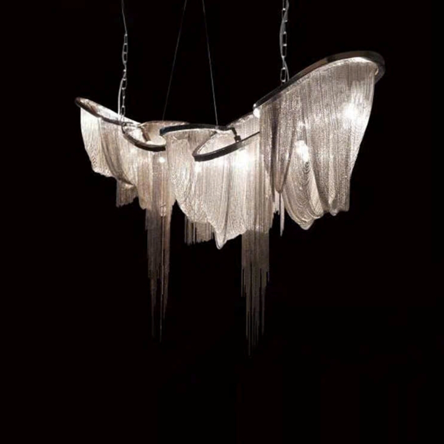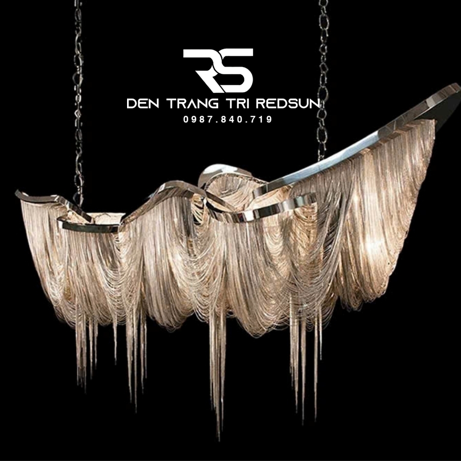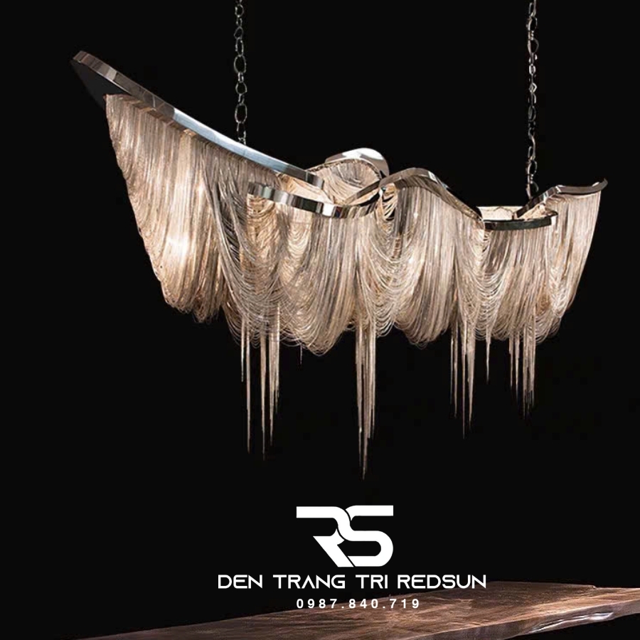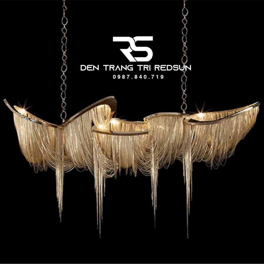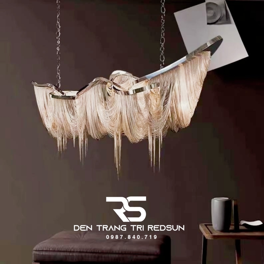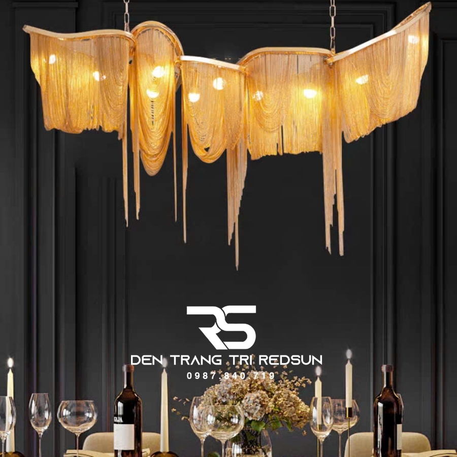 Đèn Chùm Pha Lê Tua Rua Trang Trí Phòng Khách, Phòng Ăn, Sảnh Khách Sạn, Nhà Hàng Phong Cách Italia Hiện Đại DCP-008 như một vũ điệu ánh sáng kết tinh từ những dòng thác vàng óng, tuôn chảy mềm mại từ khung kim loại sáng bóng. Các sợi ánh kim buông rủ uyển chuyển từ khung kim loại mạ sáng bóng, tạo nên nhịp điệu thị giác tinh tế – vừa bồng bềnh, vừa sắc sảo. Ánh sáng len lỏi qua từng lớp dây như những tia hoàng hôn vàng óng, nhẹ nhàng lan tỏa, khiến cả không gian như chìm trong sự ấm áp và sang trọng.