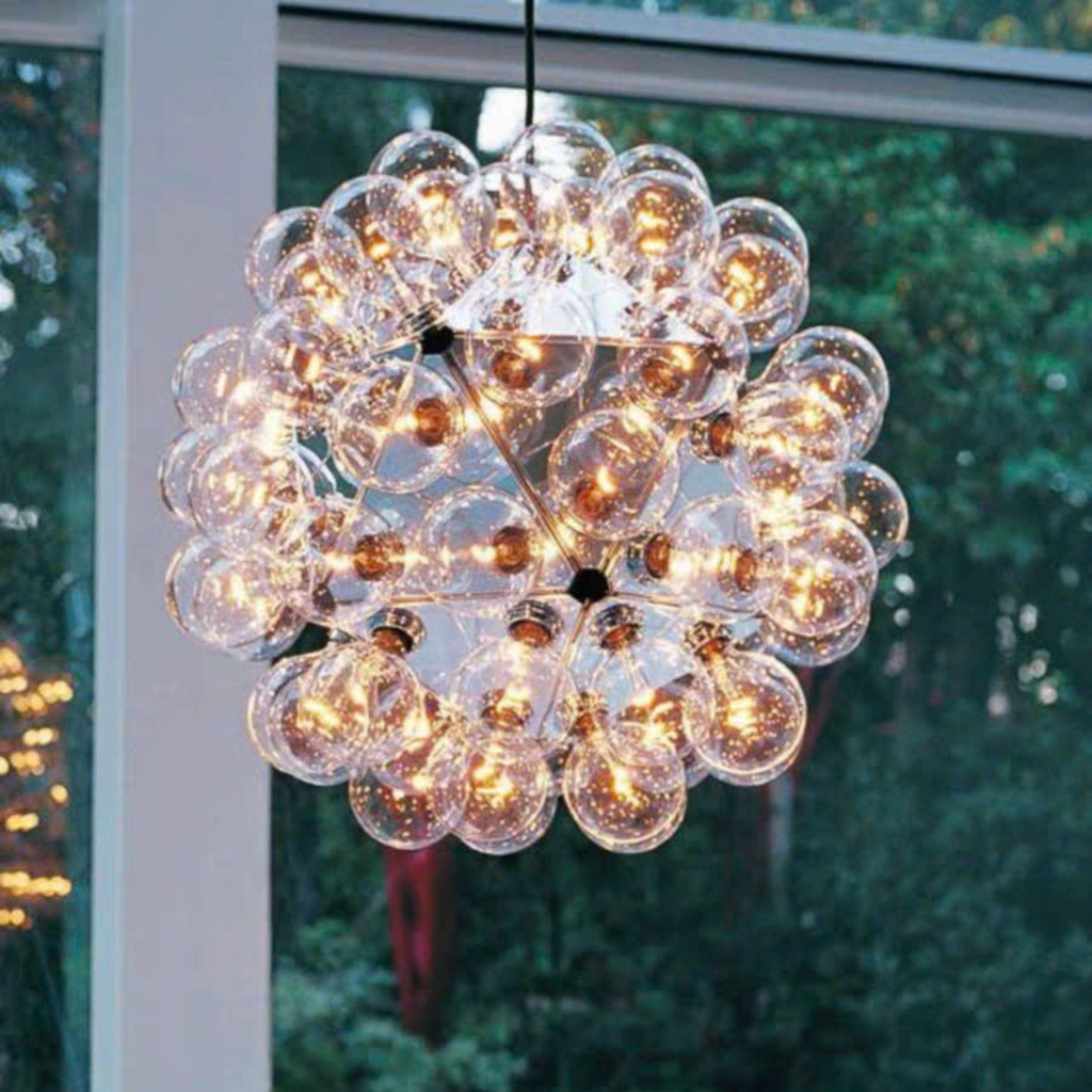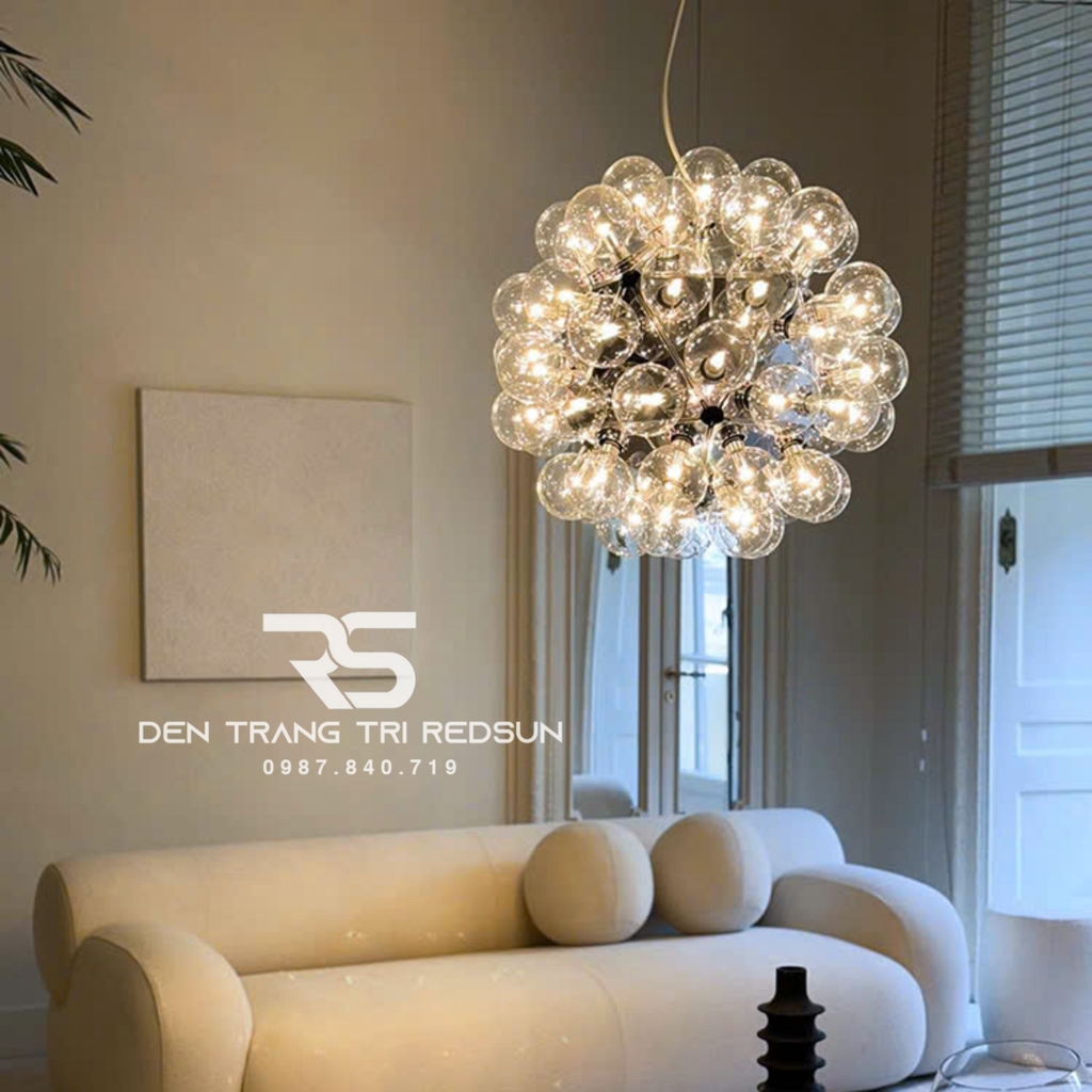 Đèn Chùm Phòng Khách Hiện Đại Bắc Âu Bong Bóng Chất Liệu Thuỷ Tinh DC-T113 mang đến một thiết kế vừa hiện đại, vừa phá cách. Các quả bóng thủy tinh tròn được sắp xếp khéo léo thành một khối cầu lớn, tạo nên hiệu ứng ánh sáng lung linh và sống động. Bên trong, ánh sáng vàng ấm phản chiếu qua từng quả cầu trong suốt, tỏa ra khắp không gian một cách mềm mại. Thiết kế này không chỉ giúp tạo điểm nhấn mà còn mang lại cảm giác thư thái cho không gian.