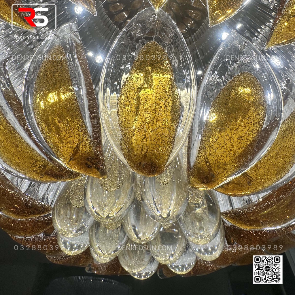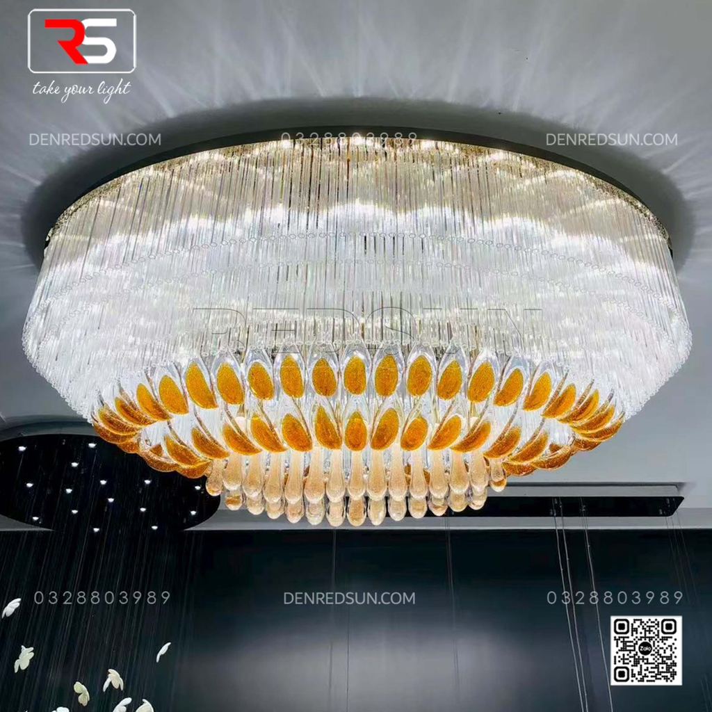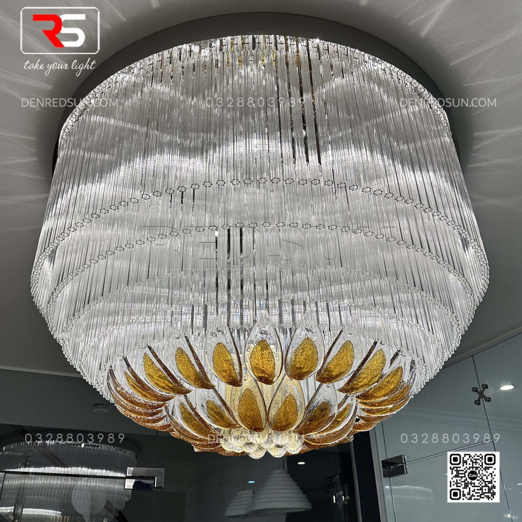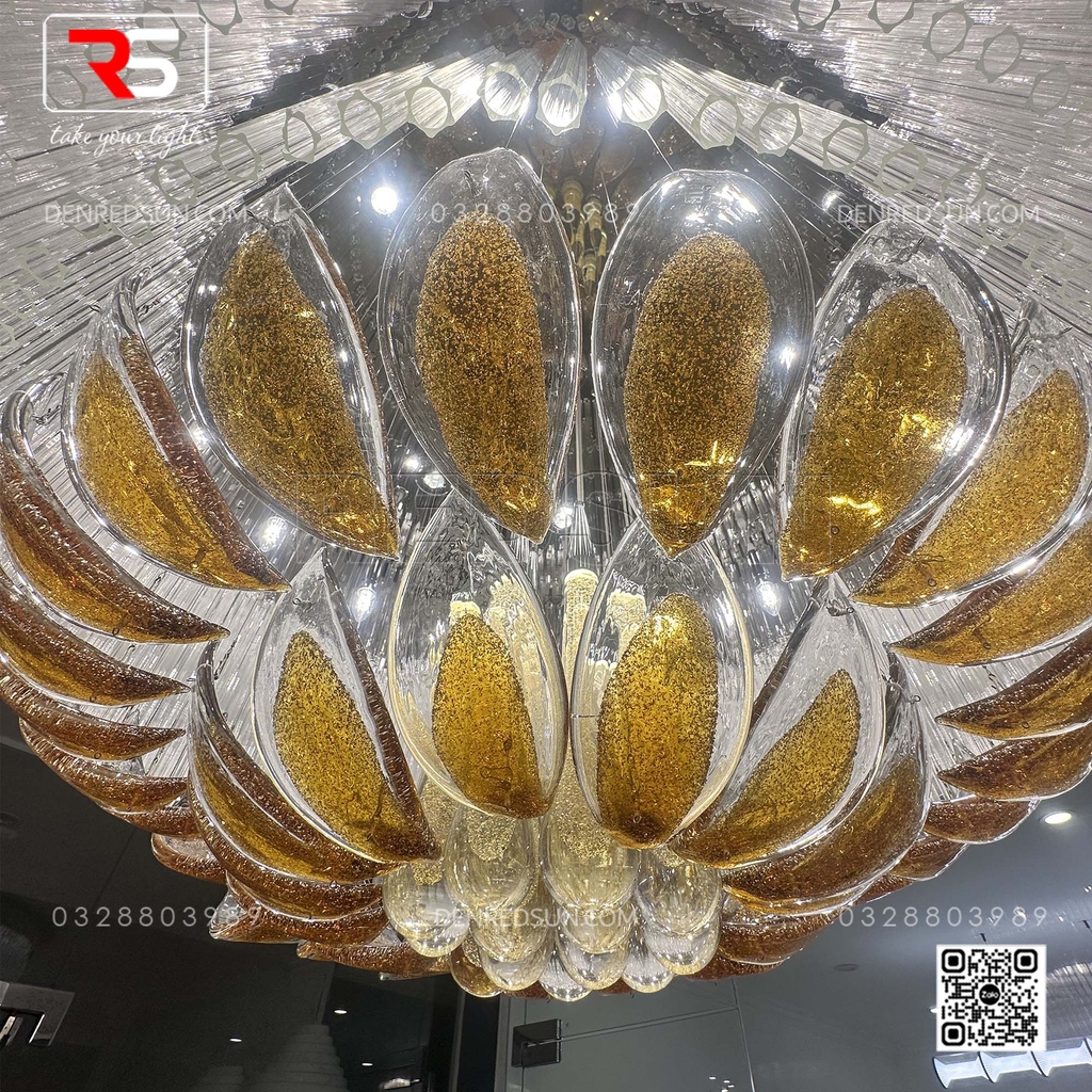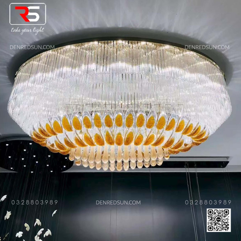 Với kích thước đồ sộ và cấu trúc xếp tầng ấn tượng, bộ đèn không chỉ cung cấp ánh sáng mà còn là một tác phẩm điêu khắc nghệ thuật ngay tại trung tâm sảnh chính hoặc phòng tiệc/phòng hội nghị. Tầng trên cùng của đèn là một vòng đai lớn gồm rất nhiều thanh thủy tinh dài trong suốt, xếp khít nhau, tạo hiệu ứng ánh sáng lấp lánh như thác nước. Lớp tiếp theo là những chi tiết trang trí hình chiếc lá hoặc cánh hoa, bao bọc lấy lớp trong cùng gồm các thanh thủy tinh hình giọt nước, tạo ấn tượng như những giọt sương hoặc giọt nước sau cơn mưa còn đọng lại trên cành lá, mang lại cảm giác gần gũi với thiên nhiên. Tất cả vật liệu thủy tinh được xử lý bằng công nghệ tráng men đặc biệt, giúp khuếch tán và khúc xạ ánh sáng, tạo ra hiệu ứng lung linh, huyền ảo và rực rỡ, làm nổi bật sự sang trọng của không gian.