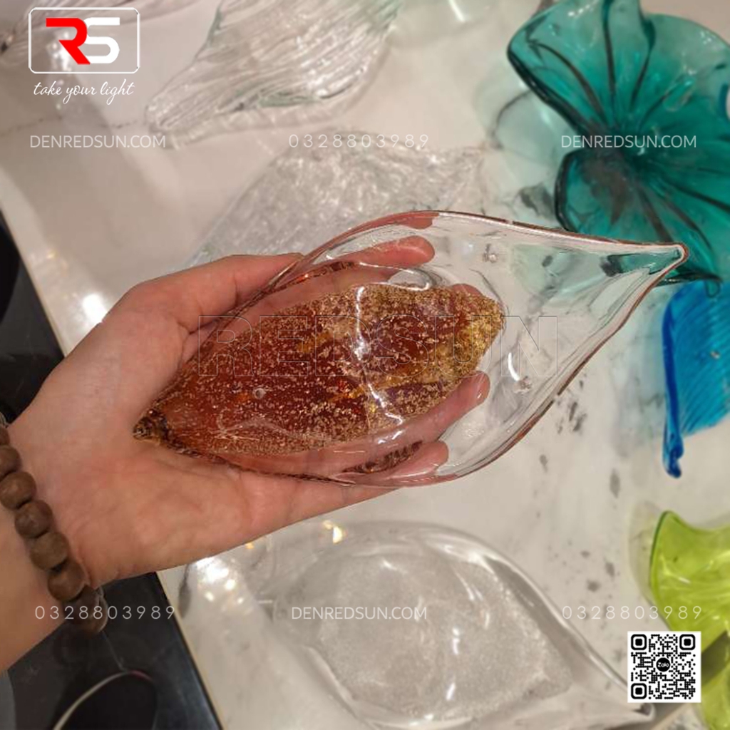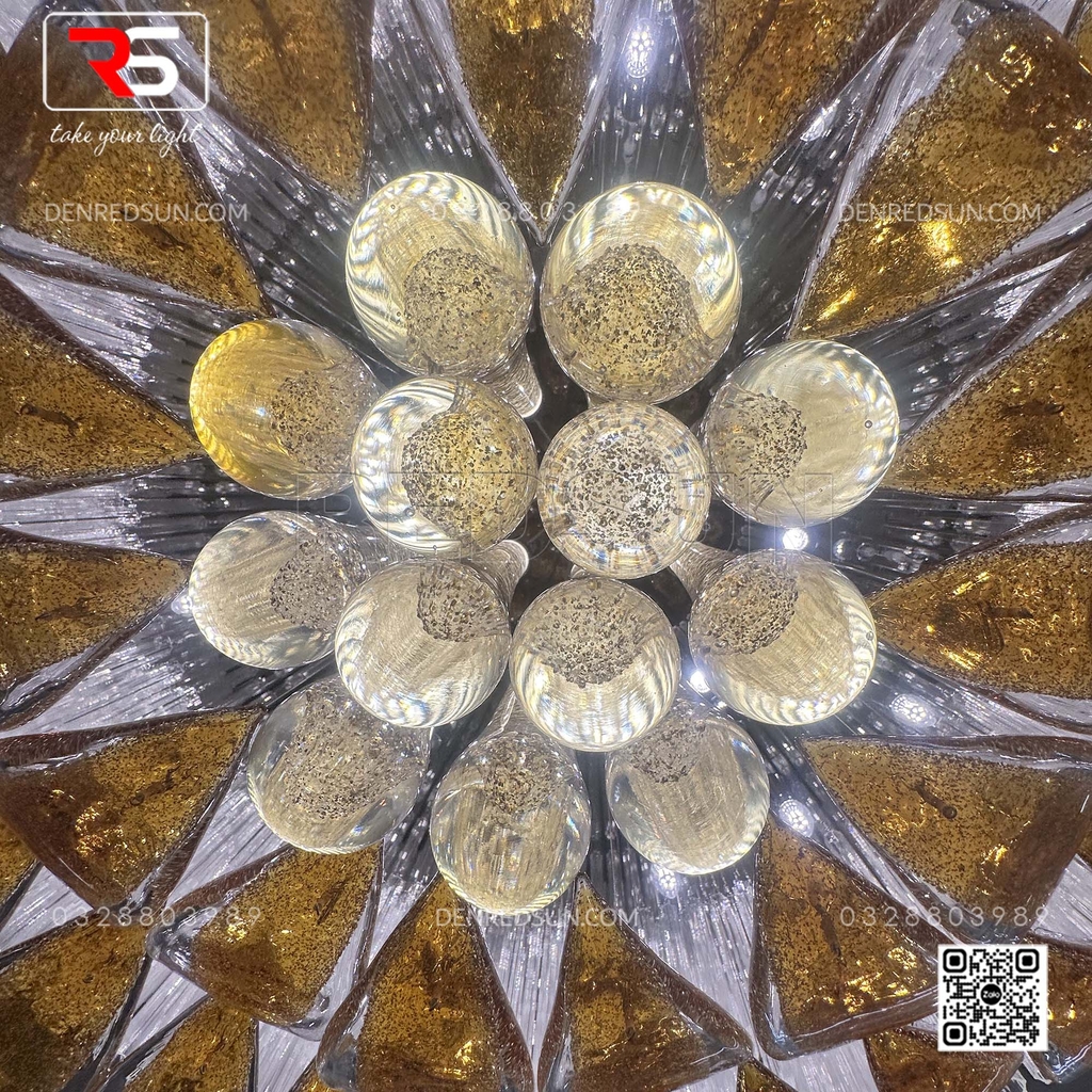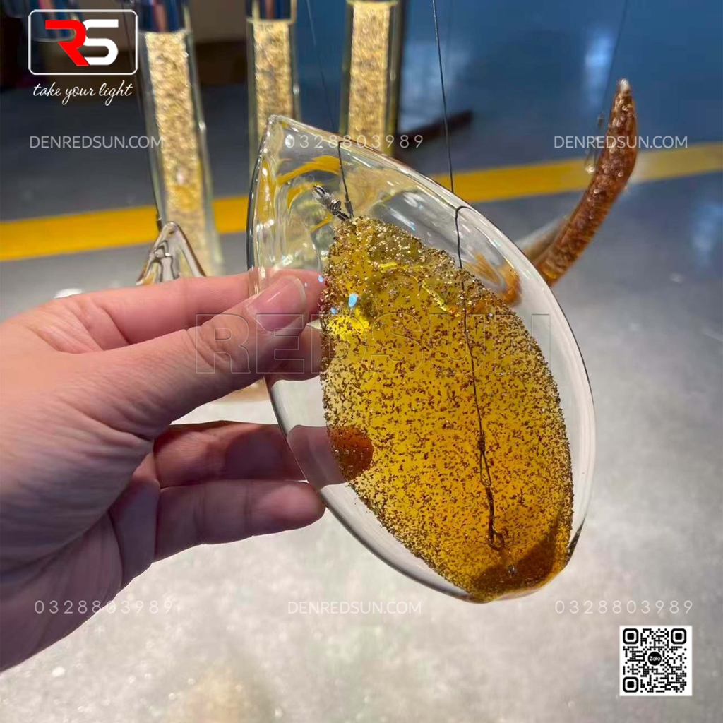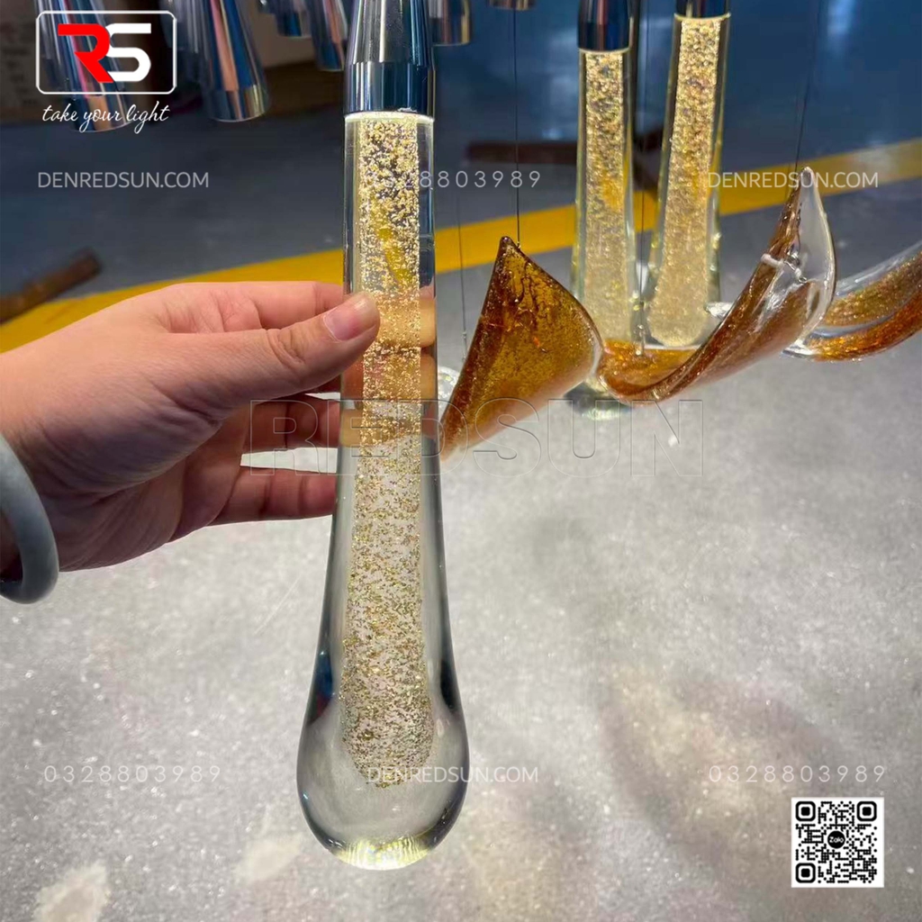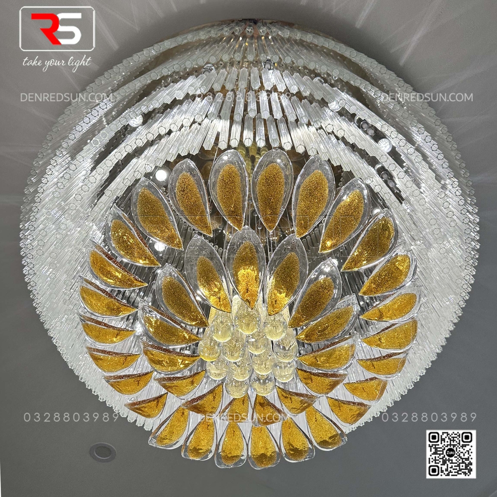 Với kích thước đồ sộ và cấu trúc xếp tầng ấn tượng, bộ đèn không chỉ cung cấp ánh sáng mà còn là một tác phẩm điêu khắc nghệ thuật ngay tại trung tâm sảnh chính hoặc phòng tiệc/phòng hội nghị. Tầng trên cùng của đèn là một vòng đai lớn gồm rất nhiều thanh thủy tinh dài trong suốt, xếp khít nhau, tạo hiệu ứng ánh sáng lấp lánh như thác nước. Lớp tiếp theo là những chi tiết trang trí hình chiếc lá hoặc cánh hoa, bao bọc lấy lớp trong cùng gồm các thanh thủy tinh hình giọt nước, tạo ấn tượng như những giọt sương hoặc giọt nước sau cơn mưa còn đọng lại trên cành lá, mang lại cảm giác gần gũi với thiên nhiên. Tất cả vật liệu thủy tinh được xử lý bằng công nghệ tráng men đặc biệt, giúp khuếch tán và khúc xạ ánh sáng, tạo ra hiệu ứng lung linh, huyền ảo và rực rỡ, làm nổi bật sự sang trọng của không gian.