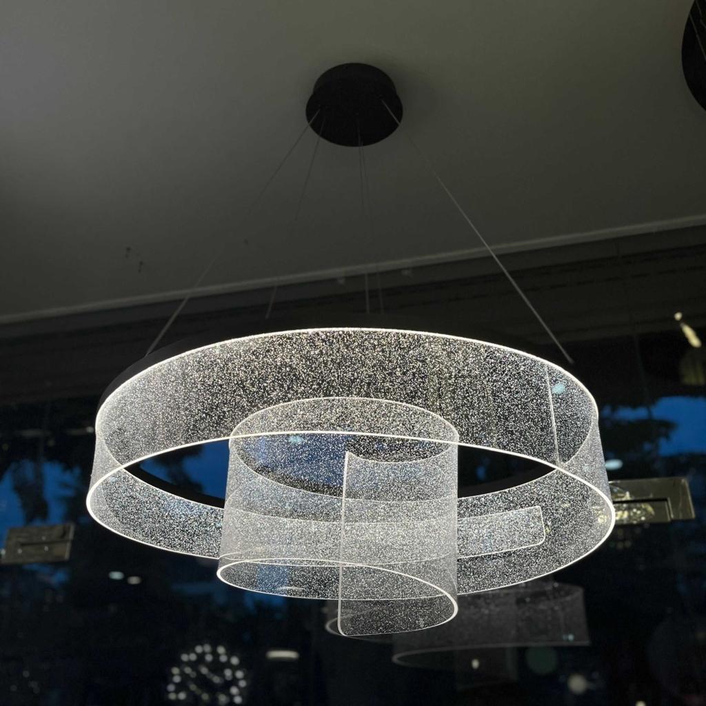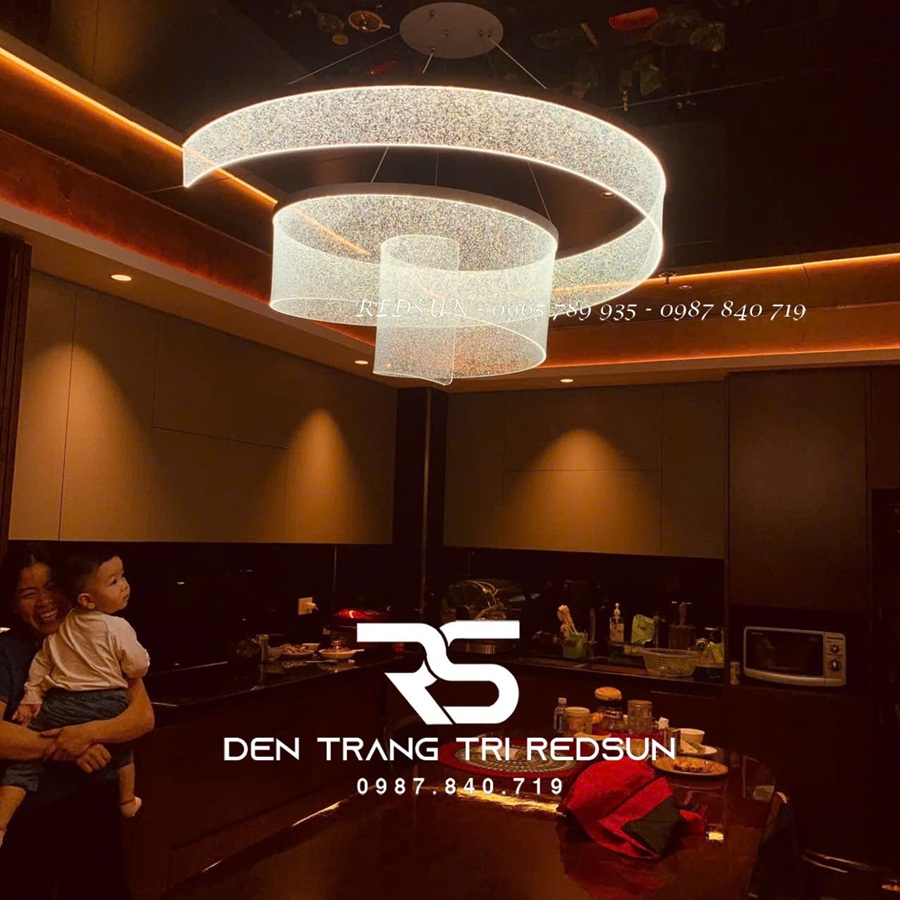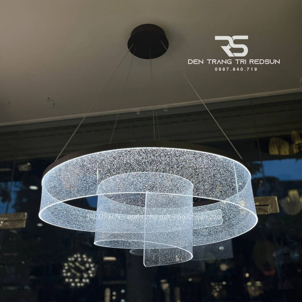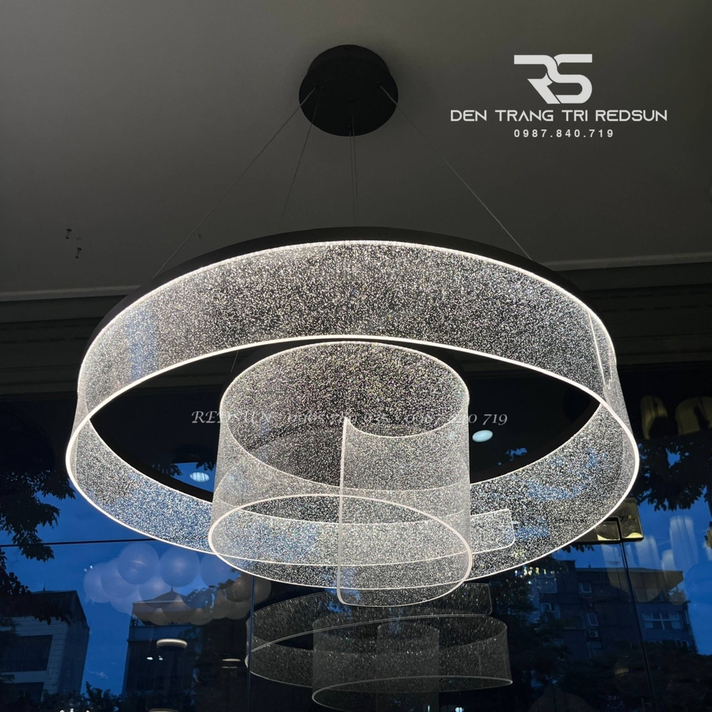 Được chế tác từ acrylic cao cấp, bề mặt đèn phản chiếu ánh sáng, mang lại cảm giác sang trọng nhưng vẫn giữ được sự nhẹ nhàng, thanh thoát. Chất liệu này không chỉ mang lại độ bền cao, dễ vệ sinh mà còn giúp ánh sáng tỏa đều và dịu mắt. Điểm đặc biệt khiến bộ đèn này chinh phục mọi tín đồ yêu ánh sáng nằm ở bộ điều khiển thông minh tích hợp dimmer. Chỉ với một thao tác điều khiển, khách hàng có thể tăng giảm cường độ ánh sáng theo ý muốn, hoặc thay đổi linh hoạt nhiệt độ màu từ trắng sáng, vàng ấm, cho đến trung tính. Đèn chùm dải lụa dáng xoắn hứa hẹn là sự lựa chọn hoàn hảo cho những ai yêu thích vẻ đẹp hiện đại, tinh tế và khác biệt.