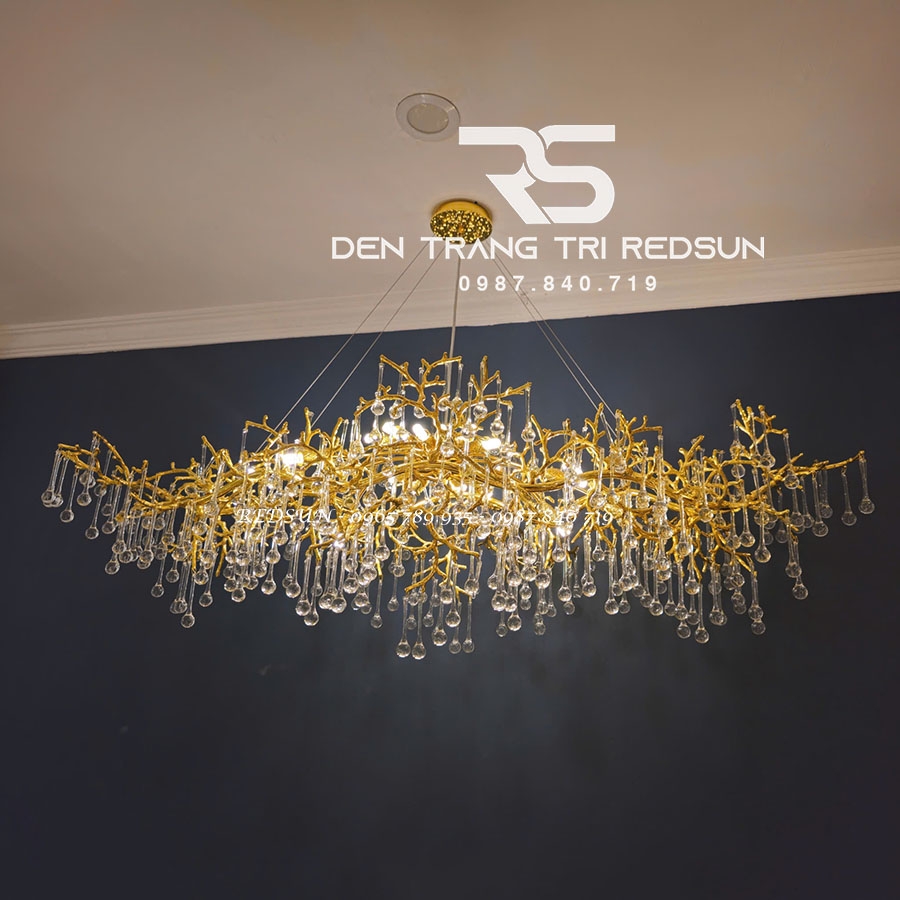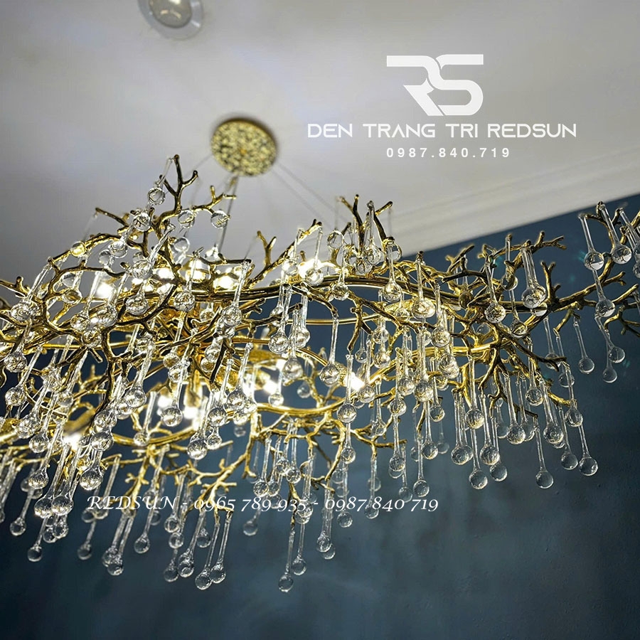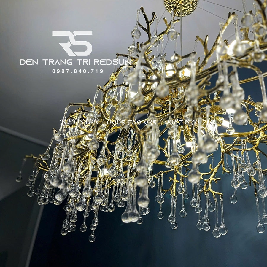 Đèn Chùm Trang Trí Phòng Khách, Phòng Ăn Serip Khung Nhôm Giọt Nước Thuỷ Tinh MM - TH - 8016 - 25 với sự kết hợp tinh tế giữa khung nhôm đúc cao cấp mạ vàng và những hạt pha lê hình giọt nước long lanh, tạo nên một bố cục mềm mại như những cành cây khô buông mình trong mưa. Mỗi giọt pha lê rủ xuống phản chiếu ánh sáng lung linh, mang đến cảm giác huyền ảo và sang trọng cho không gian.