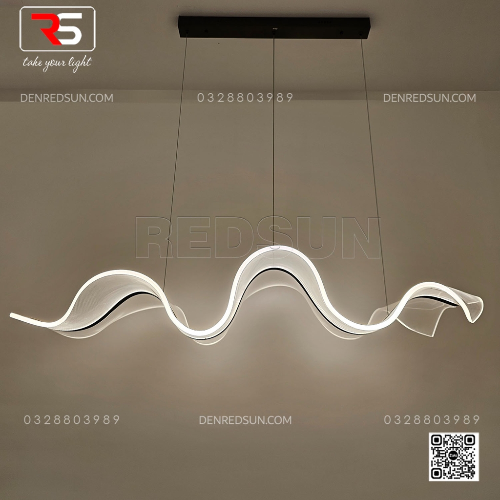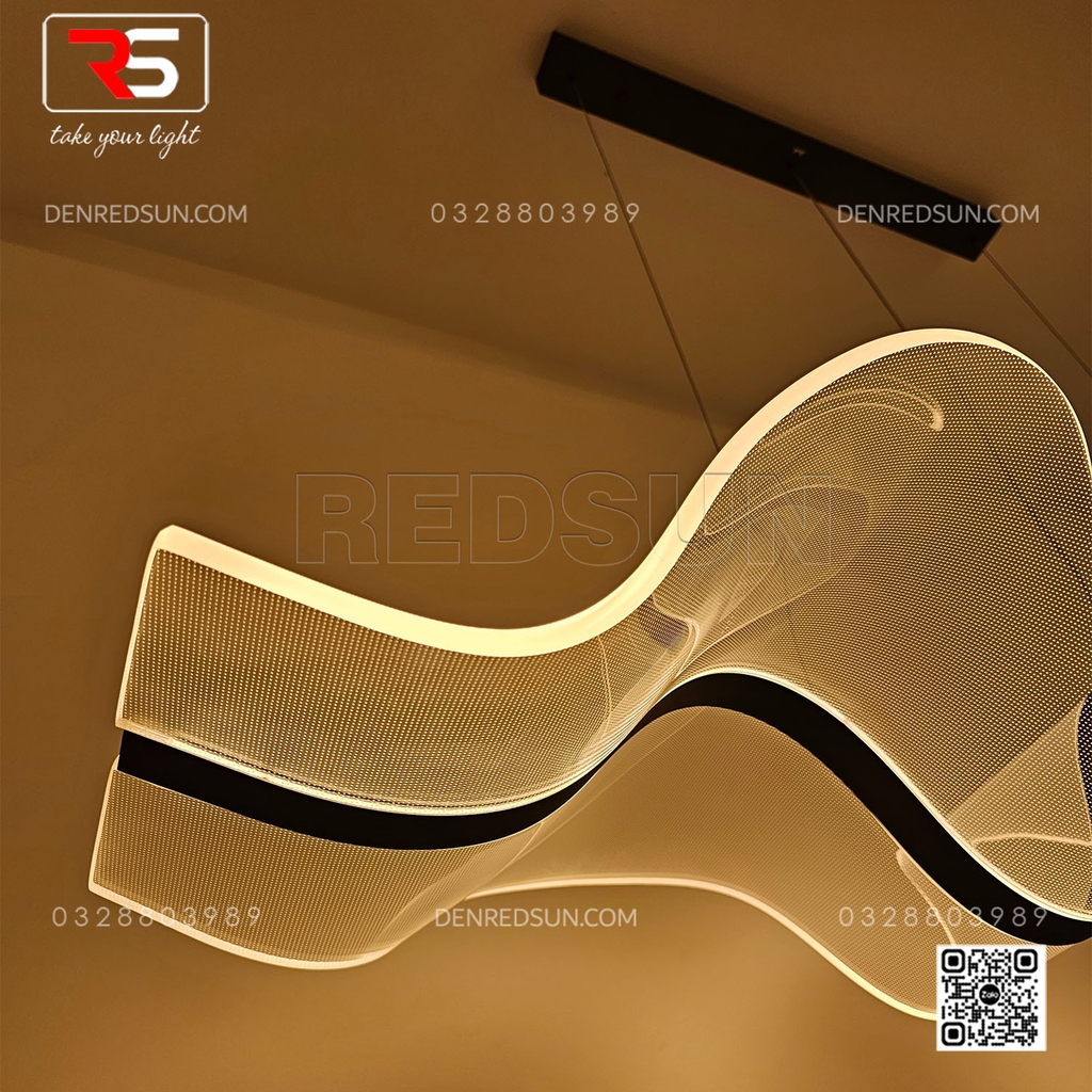 Đèn Thả Dải Lụa Cao Cấp Lắp Bàn Ăn, Bàn Đảo, Quầy Lễ Tân Phong Cách Bắc Âu Hiện Đại Chất Liệu Acrylic MK5890P-001-DZ-01-2.4 có điểm nhấn đặc biệt chính là phần thân đèn được tạo hình sóng nước mềm mại bất đối xứng, tựa như dải lụa bay trong gió. Thiết kế này phá vỡ những đường nét thẳng cứng nhắc, tạo cảm giác chuyển động và thanh thoát cho không gian. Sản phẩm sử dụng vật liệu acrylic dày dặn chắc chắn nhưng vẫn giữ được nét mềm mại, bay bổng. Ngoài ra, dải đèn acrylic có khả năng tán quang tốt và các đường vân sọc mờ trên bề mặt giúp ánh sáng tỏa đều và không gây chói mắt.