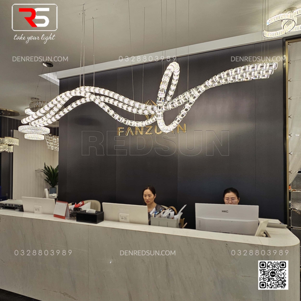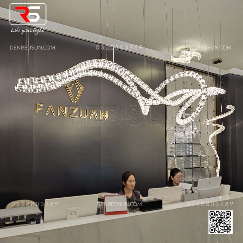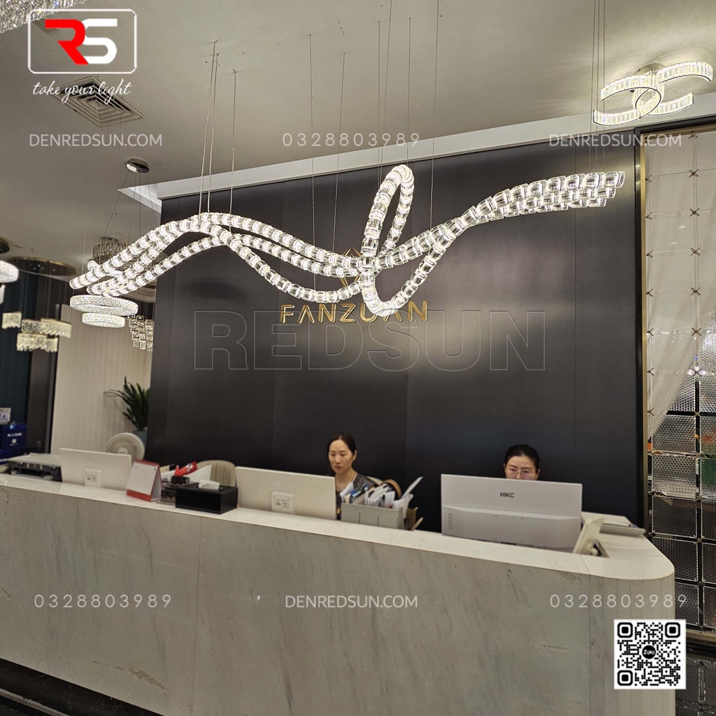Khác với những mẫu đèn chùm truyền thống có hình khối cứng nhắc, HTK-NKFZ009 sở hữu các đường cong uốn lượn tự do, mềm mại như một dòng suối ánh sáng lấp lánh trôi lơ lửng. Thiết kế này phá vỡ sự khô khan của những khối kiến trúc vuông vức tại quầy lễ tân, mang lại vẻ đẹp uyển chuyển và đầy sức sống. Đèn được cấu tạo từ hàng trăm mắt xích pha lê cao cấp, bao bọc hệ thống LED hiện đại bên trong. Ban ngày, những viên pha lê bắt sáng tự nhiên, tạo nên vẻ sang trọng, tinh tế. Ban đêm, ánh sáng tán xạ qua các lớp pha lê trong suốt tạo ra hiệu ứng lung linh, huyền ảo nhưng vẫn đủ êm dịu để không gây chói mắt cho khách hàng và nhân viên khi giao dịch.