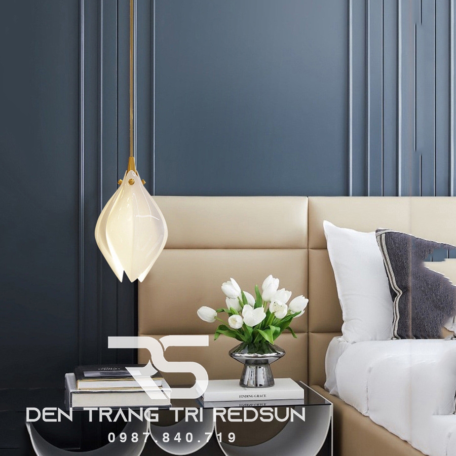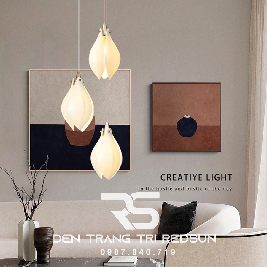 Đèn Thả Phong Cách Hiện Đại Hoa Mộc Lan Lắp Phòng Khách, Sảnh Chờ, Cầu Thang Thông Tầng HTK052 có thiết kế như một nụ hoa mộc lan đang bung nở, với tông màu trắng sứ tao nhã, thanh khiết, đường nét đơn giản mà tinh tế tạo nên vẻ đẹp thu hút ánh nhìn. Chao đèn bằng thuỷ tinh mờ giúp ánh sáng đèn toả ra thêm phần dịu nhẹ, không gây chói mắt, mang đến một cảm giác ấm áp và thư giãn cho không gian lắp đặt.