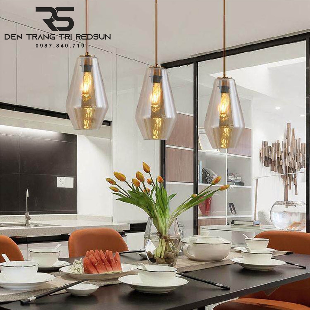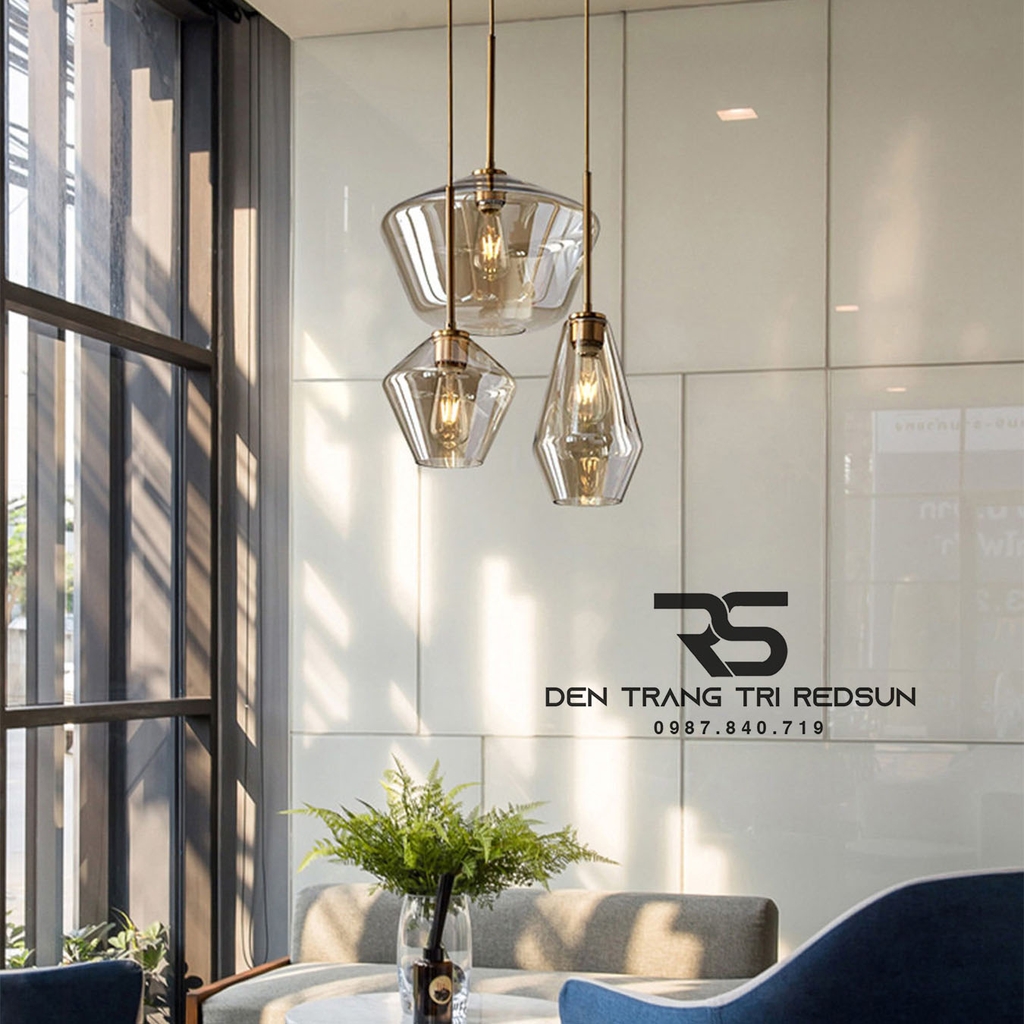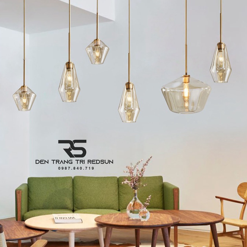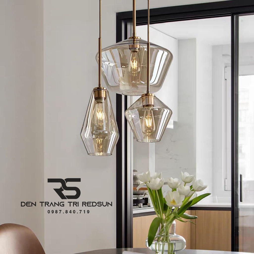 Đèn Thả Phòng Khách, Phòng Ngủ, Bàn Ăn Phong Cách Bắc Âu Hiện Đại CDT-T072 là mẫu đèn thả nghệ thuật với sự kết hợp của các khối đa diện bằng thủy tinh, mang lại vẻ đẹp vừa hiện đại vừa tinh tế. Chao đèn màu hổ phách (màu trà) trong suốt, có độ bóng cao, giúp làm dịu ánh sáng và tạo cảm giác ấm cúng, sang trọng. Phần trụ đèn và dây thả có màu vàng đồng được sơn tĩnh điện cao cấp, tạo điểm nhấn cổ điển và chắc chắn. Đèn sử dụng bóng LED Edison vừa tạo điểm nhấn thẩm mỹ vừa mang hơi thở cổ điển, phù hợp với cả các thiết kế hiện đại lẫn thiết kế theo phong cách Retro.